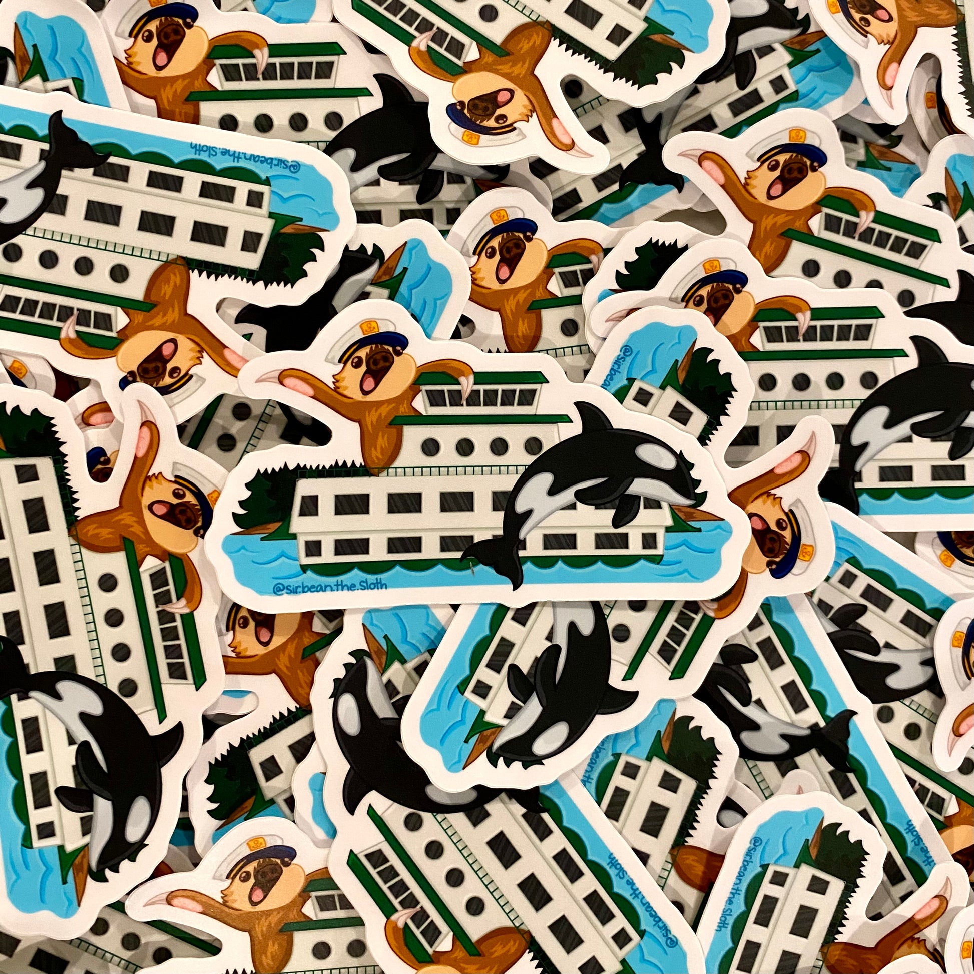 Image Description: A white and green ferry boat sits in blue water with an evergreen forest in the background. Sir Bean hangs off the top left side, reaching one hand out and the other on the top of the ferry. He wears a white and blue boat captain hat. An Orca whale jumps in front of the ferry.